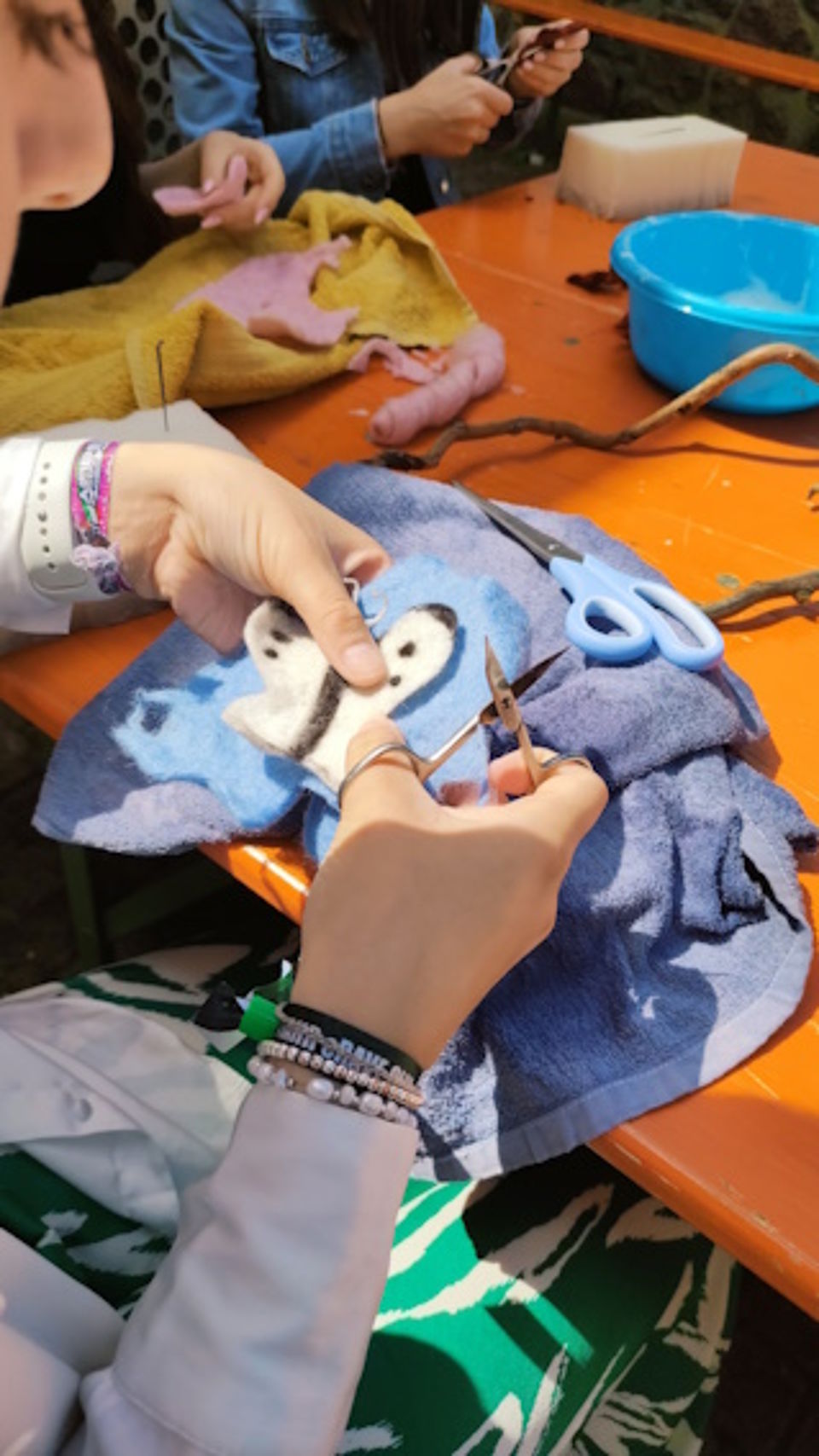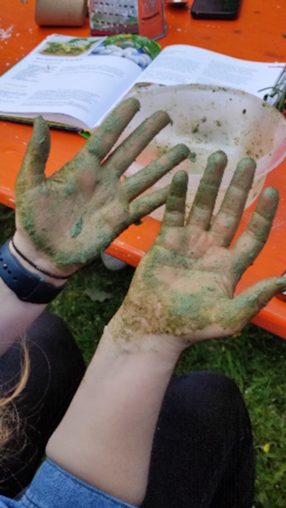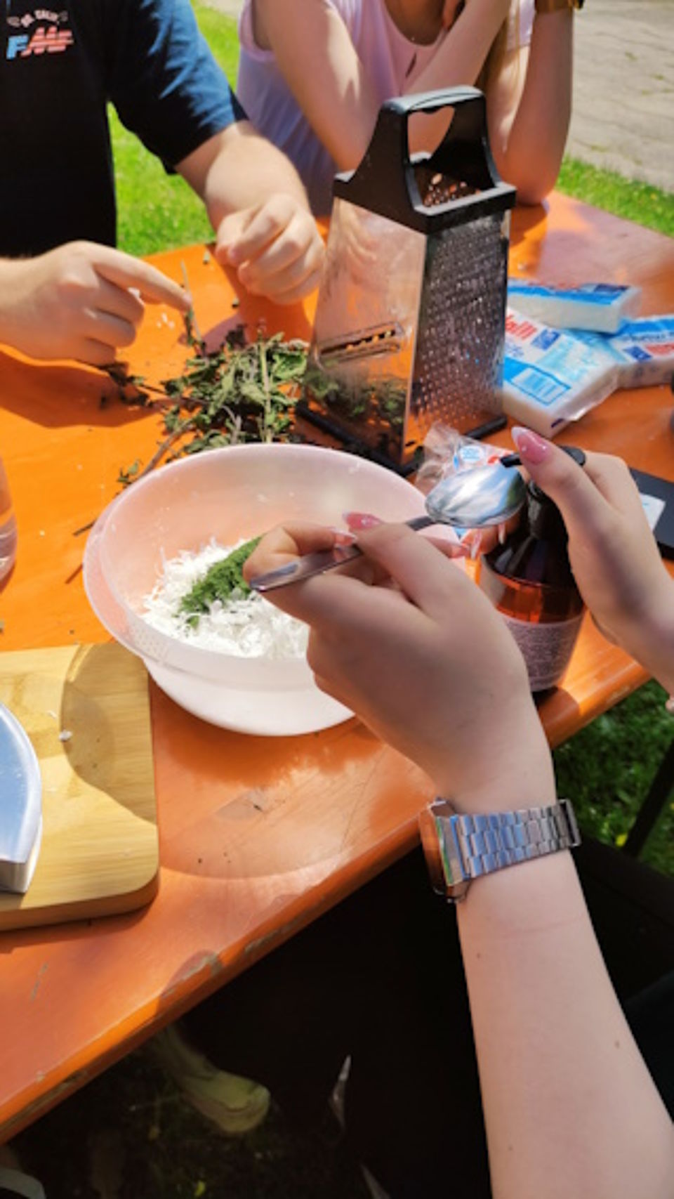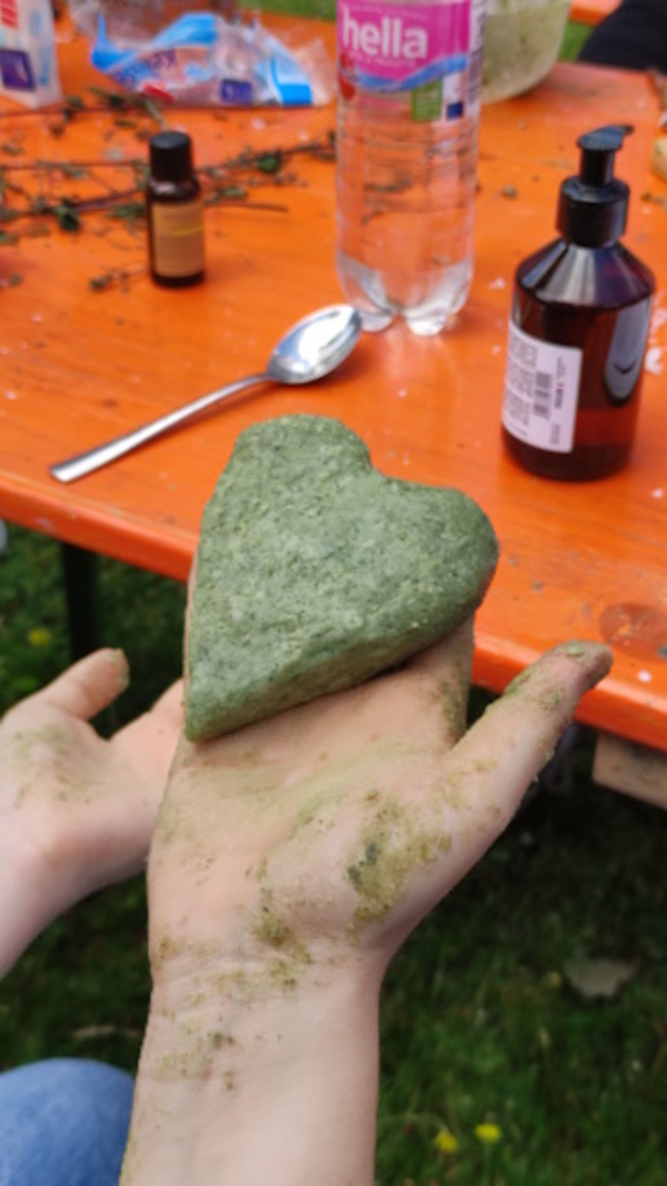 Höhepunkt war die ausgiebige Arbeit in den verschiedenen Stationen. Unter anderem wurde aus Naturmaterialien Salbe oder auch Seife hergestellt. Insbesondere bei der Seife erforderte dies einiges an manueller Arbeit. Ebenso wurden aus Holz Vogelpfeifen und Klangfrösche hergestellt. Hier bewiesen die Schüler*innen Ausdauer und Geschicklichkeit. Auch mit Textilien wurde gearbeitet. So wurden durch rabiate Nutzung von Hämmern die Farbe von eigenen gesammelten Blüten auf kleine Jute-Beutel übertragen, sodass jeder Beutel zu einem Einzelstück wurde. An der Filzstation wurden Kleeblätter, Marienkäfer und weitere thematisch passende Stücke gefertigt.