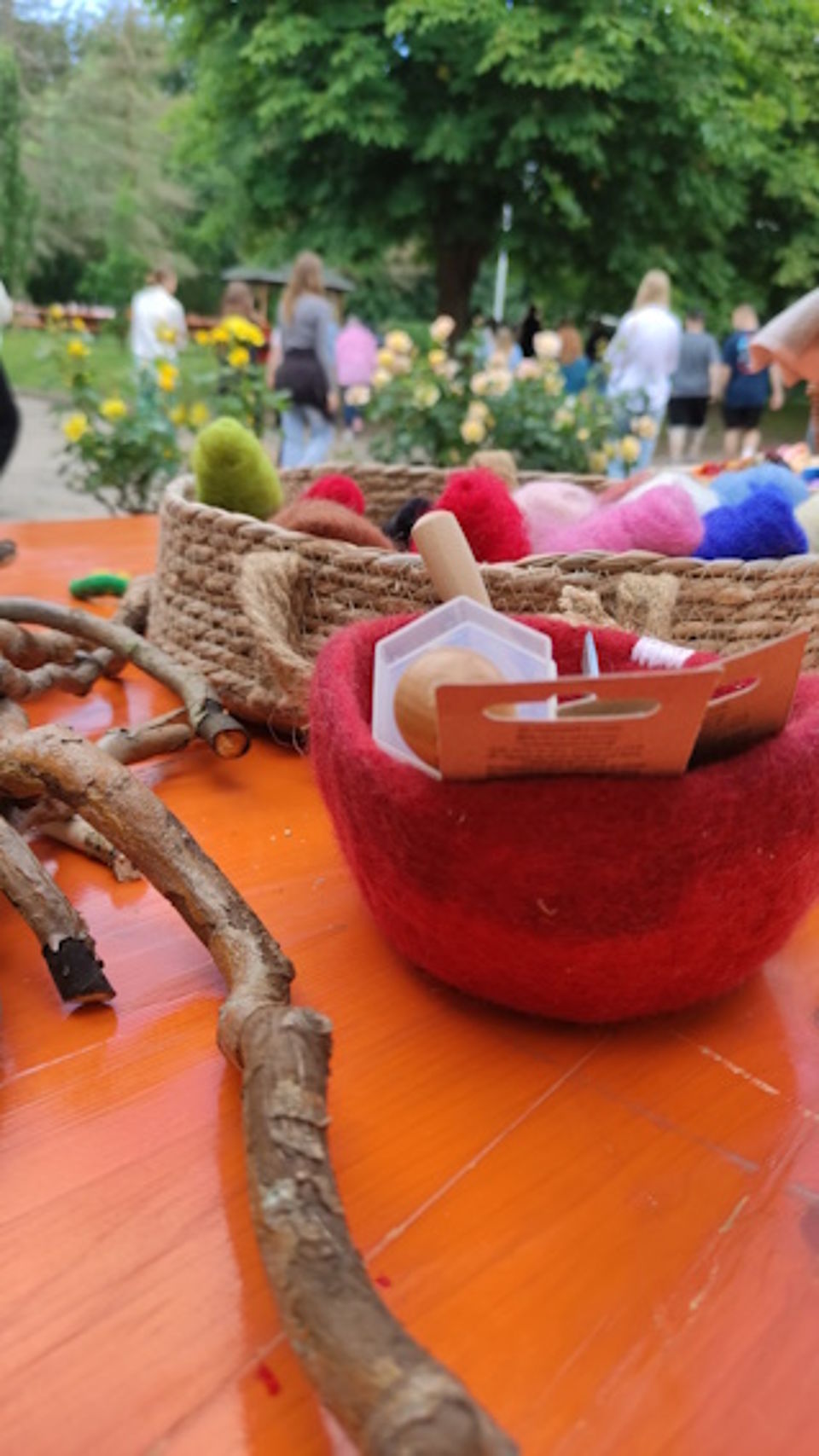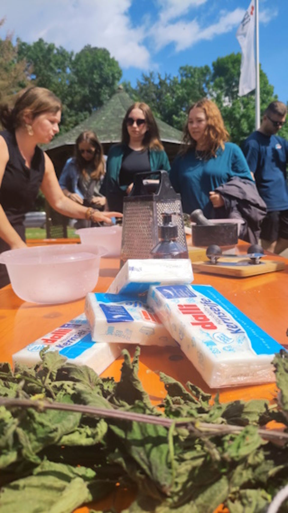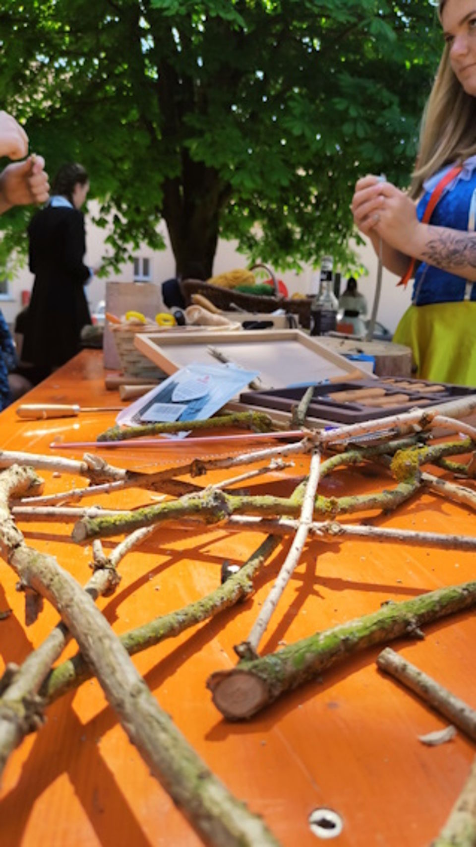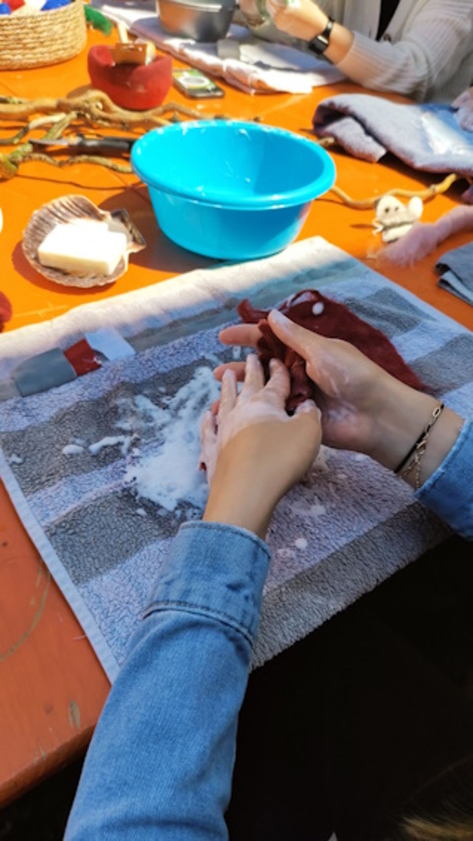 Höhepunkt war die ausgiebige Arbeit in den verschiedenen Stationen. Unter anderem wurde aus Naturmaterialien Salbe oder auch Seife hergestellt. Insbesondere bei der Seife erforderte dies einiges an manueller Arbeit. Ebenso wurden aus Holz Vogelpfeifen und Klangfrösche hergestellt. Hier bewiesen die Schüler*innen Ausdauer und Geschicklichkeit. Auch mit Textilien wurde gearbeitet. So wurden durch rabiate Nutzung von Hämmern die Farbe von eigenen gesammelten Blüten auf kleine Jute-Beutel übertragen, sodass jeder Beutel zu einem Einzelstück wurde. An der Filzstation wurden Kleeblätter, Marienkäfer und weitere thematisch passende Stücke gefertigt.