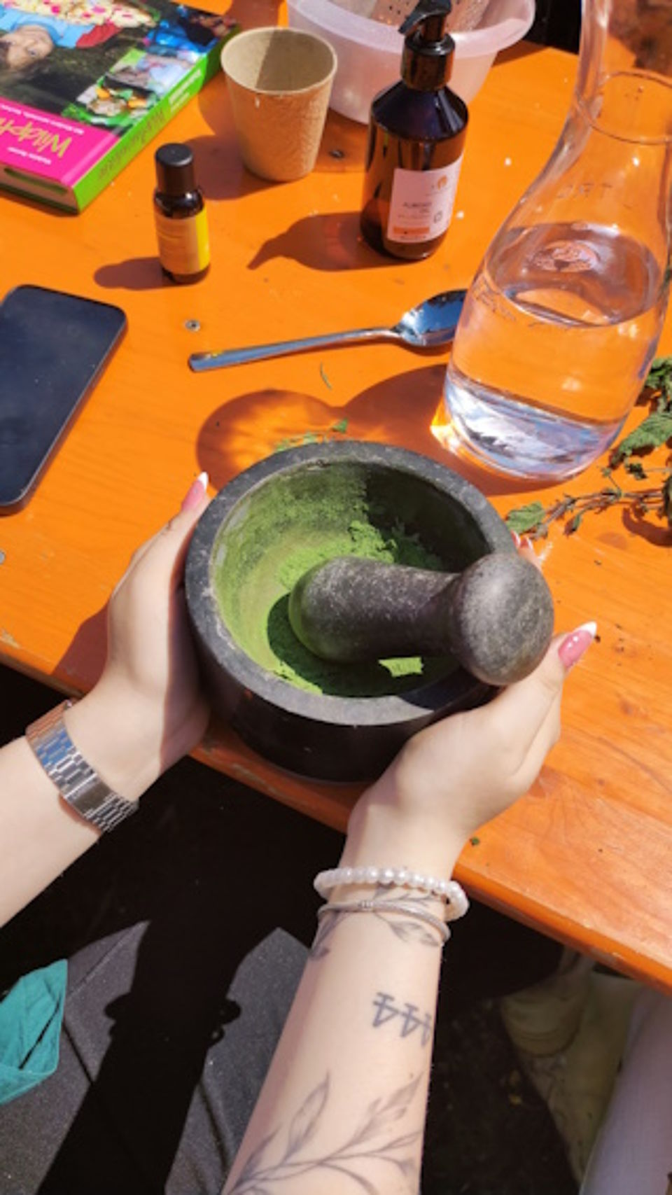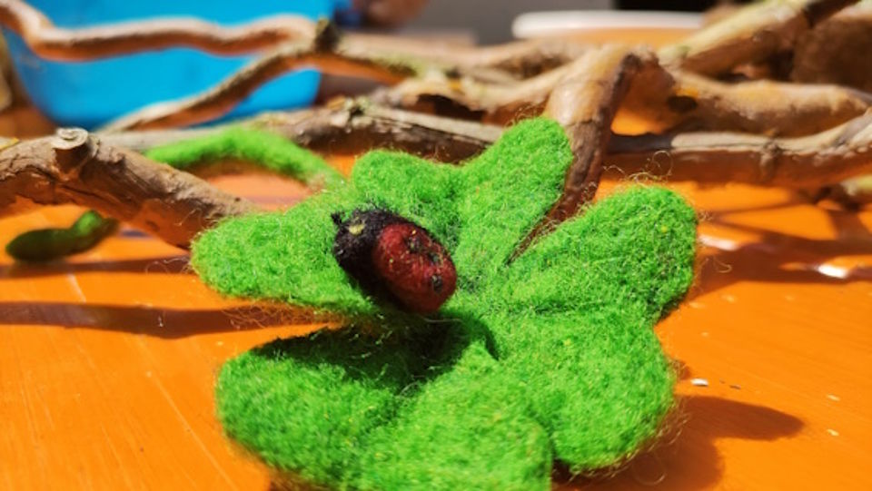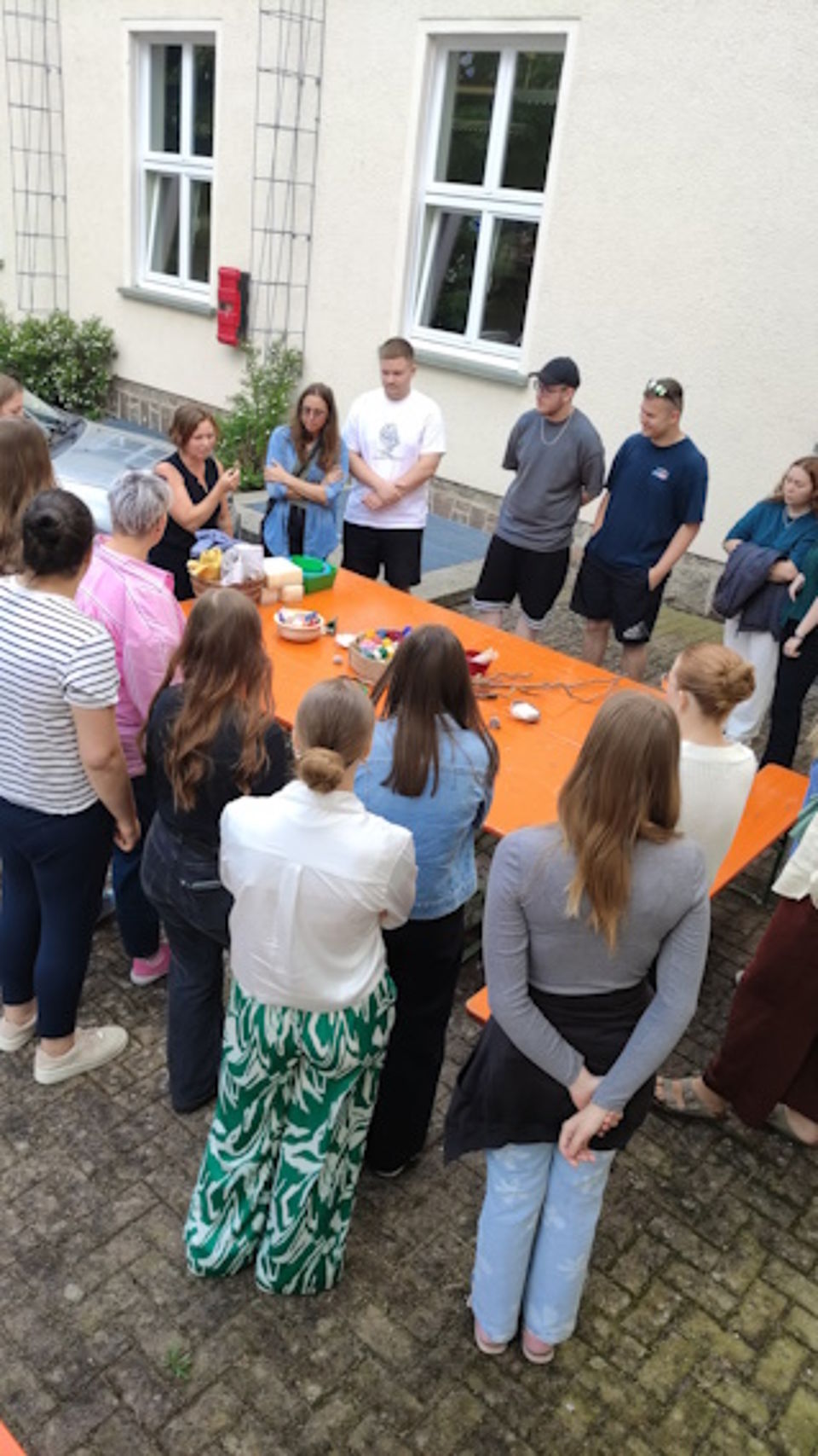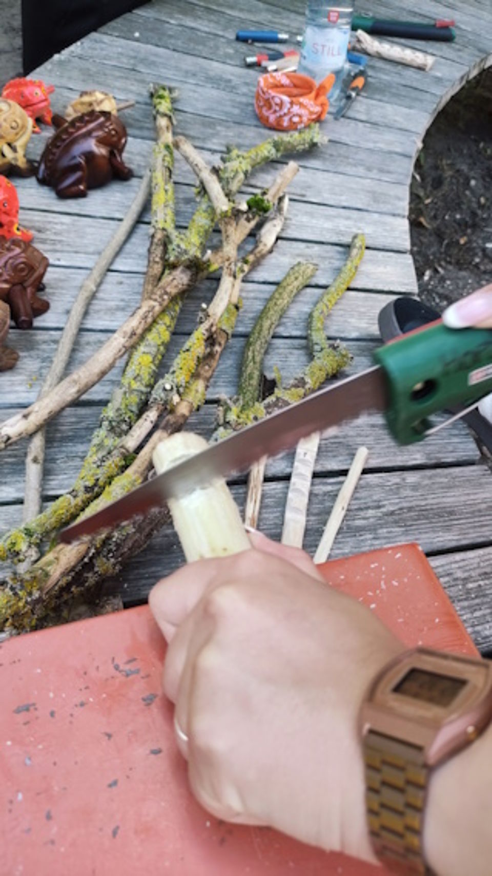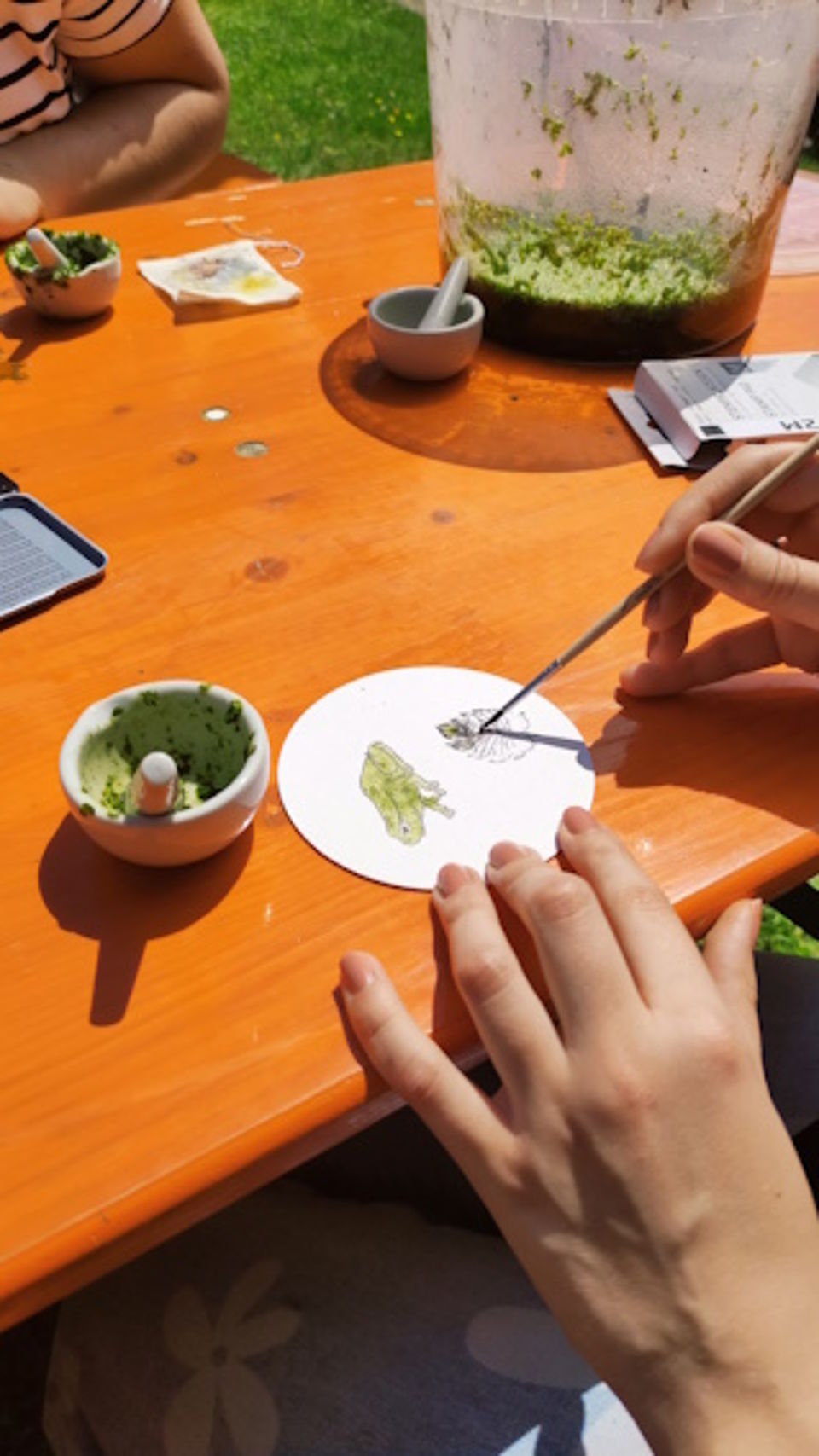 Höhepunkt war die ausgiebige Arbeit in den verschiedenen Stationen. Unter anderem wurde aus Naturmaterialien Salbe oder auch Seife hergestellt. Insbesondere bei der Seife erforderte dies einiges an manueller Arbeit. Ebenso wurden aus Holz Vogelpfeifen und Klangfrösche hergestellt. Hier bewiesen die Schüler*innen Ausdauer und Geschicklichkeit. Auch mit Textilien wurde gearbeitet. So wurden durch rabiate Nutzung von Hämmern die Farbe von eigenen gesammelten Blüten auf kleine Jute-Beutel übertragen, sodass jeder Beutel zu einem Einzelstück wurde. An der Filzstation wurden Kleeblätter, Marienkäfer und weitere thematisch passende Stücke gefertigt.