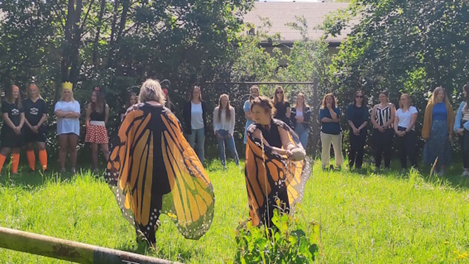 Nach einem Begrüßungstanz, bei dem die Dozentinnen Kira Sittner und Agnes Kotyrba-Krechel in die Rolle von Schmetterlingen schlüpften, waren die Teilnehmenden aufgefordert, durch geschicktes Fragen herauszufinden, welches Tier ihnen auf dem Rücken klebt.