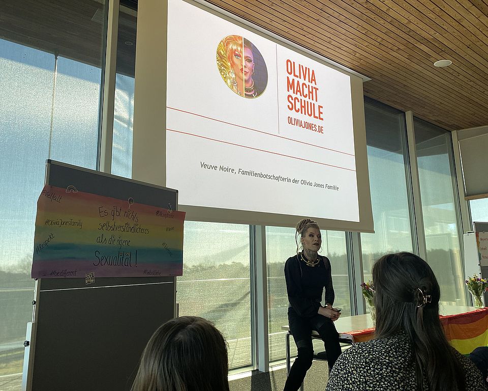 Am 28.02.2023 war Dragqueen Veuve Noir bei uns im DRK Bildungszentrum Teterow zu Gast um von ihren Erfahrungen mit Diskriminierung und Ausgrenzung zu berichten und mit unseren Schüler*innen zu diskutieren.